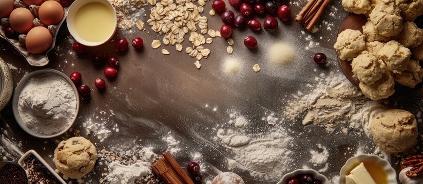 A food photography of various raw ingredients like oat biscuits cookie dough egg sugar flour butter cranberries and vanilla with a bake theme and copy space image