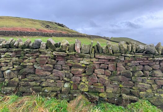 Rain soaked landscape, and weathered dry stone walls, with distant hills and roads near, Haygill Nook, Silsden, UK