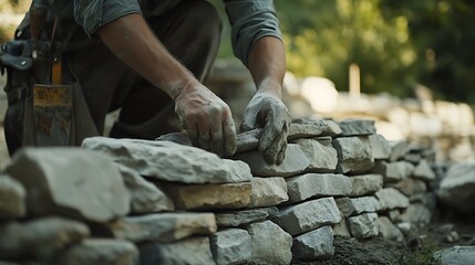 Stone steps and dry stone wall under construction  -   landscaping works with natural stones