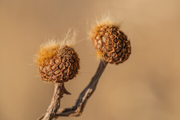 Close-up of two dried thistles with spiky seed heads in warm lighting, against a blurred, neutral background