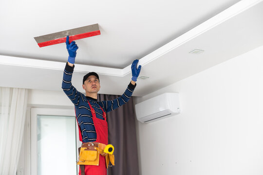 Man plastering drywall in a private house