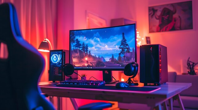 Futuristic gaming setup with neon lighting and dual screens