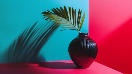 Modern black vase with tropical green leaves on colorful dual tone red and blue wall background