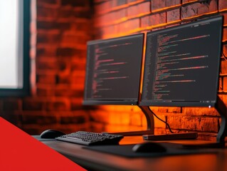modern workplace with dual monitors displaying code and illuminated brick wall background