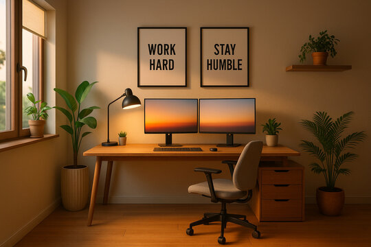 Modern Dual Monitor Office Desk Setup with Soft Lighting and Plant Decor, Professional Workspace .