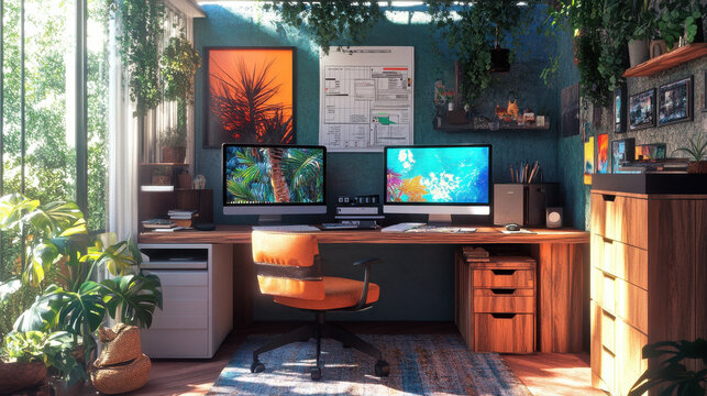 A modern workspace with dual monitors, laptop, and plants creating a productive environment