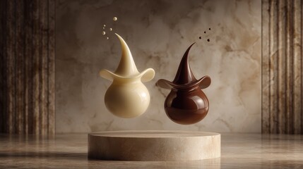 Two contrasting liquid forms hover above a minimal stone pedestal in a refined setting