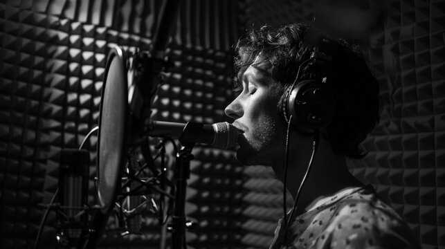 Voiceover artist readies for dubbing in soundproof studio for accurate vocal performance