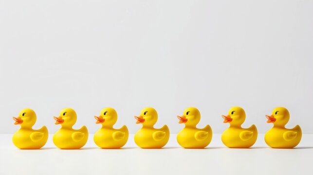 yellow plastic squeaky rubber ducks in a row, copy and text space, 16:9