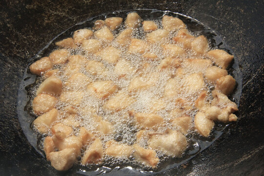 Large chunks of raw lamb fat dumba are fried in oil with bubbles in a black cauldron close-up, cooking food
