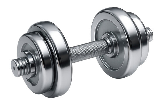 Shiny chrome dumbbell with textured grip showcasing fitness equipment on transparent background.