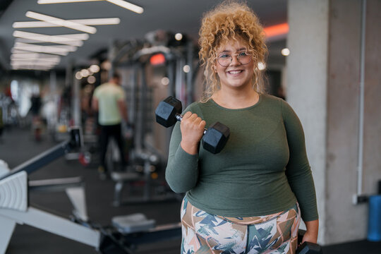 Caucasian woman exercising at home with dumbbells for fitness blog
