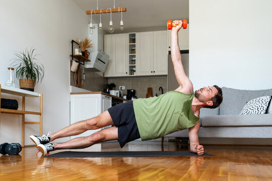 Man does anaerobic workout at home, lifting dumbbell in side plank position.