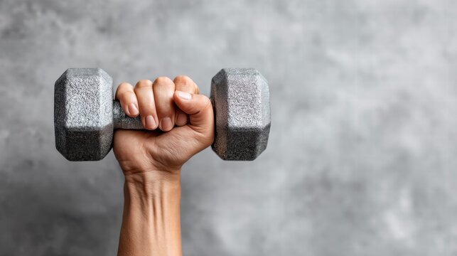 Hand holding a dumbbell against a gray background