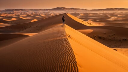 A lone person walking on the crest of a sand dune in a vast desert at sunset.