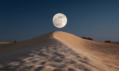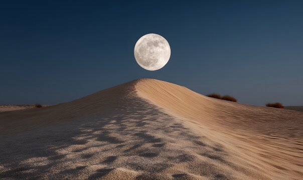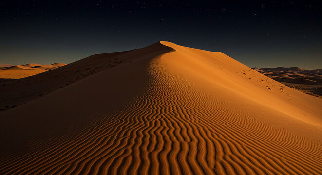 A large sand dune with visible ripples under a dark blue sky with a few stars visible above it