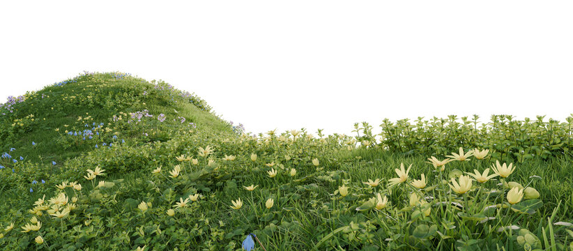 Verdant Hill Blooming with Yellow Flowers in Spring. 3D render.