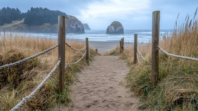 Sandy pathway leads to a serene beach with ocean and rock formations under a cloudy sky.