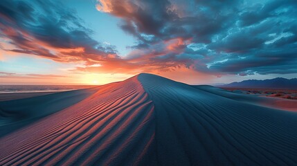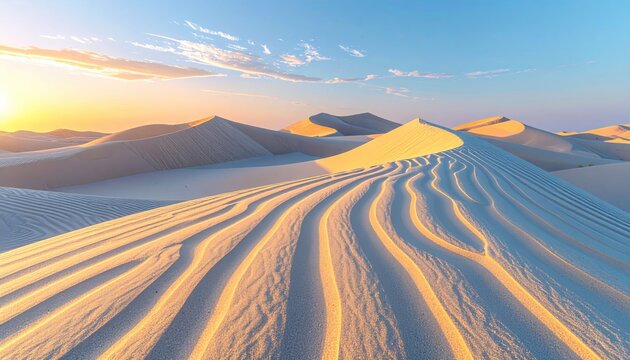 Glowing sunrise over desert sand dunes with wind-sculpted ripples