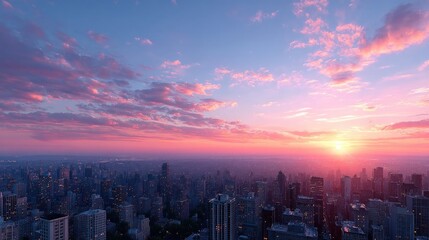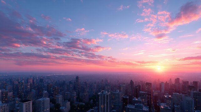 Vibrant Cityscape at Sunset with Buildings Under a Sky of Pink and Purple Clouds