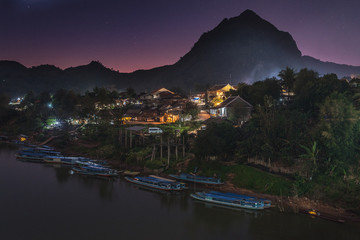 Quiet village of Nong Khiaw along the Nam Ou river and the scenic moutains around at the dusk Laos