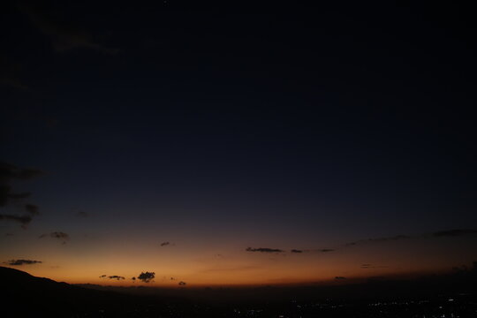 A silhouetted landscape dominates the frame, featuring rolling hills bathed in the warm glow of a dusky sunset. The foreground is dark,