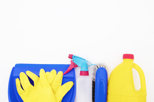 Cleaning supplies against white background with copy space