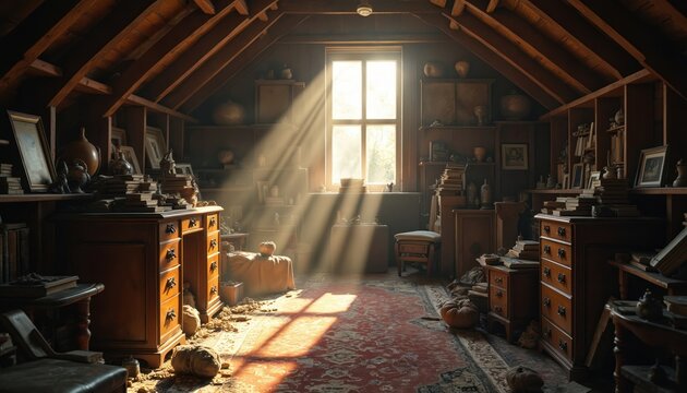 A dusty attic filled with forgotten belongings, boxes stacked high, and beams of sunlight piercing the gloom.