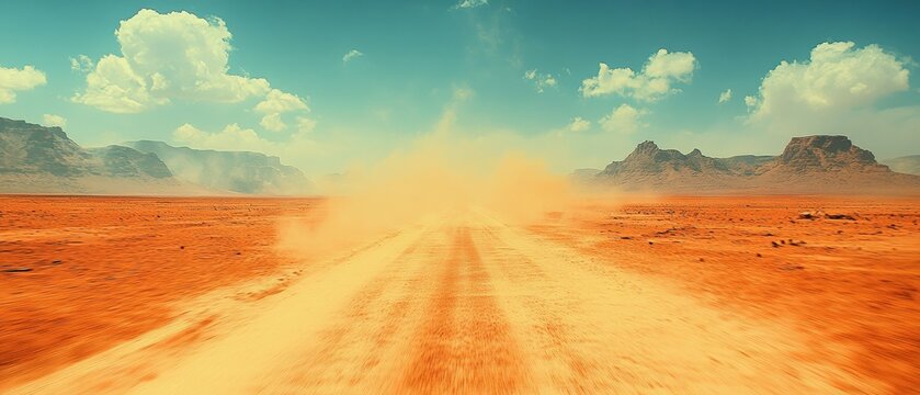 wide angle landscape of a desert wasteland with a dusty sandstorm going on
