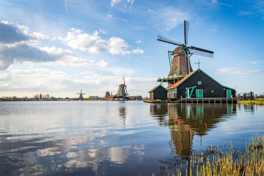 traditional dutch windmills reflecting in lake at zaanse schans