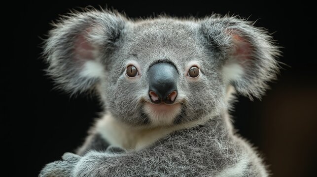 Close-Up Portrait of an Adorable Koala with Soft Fur and Curious Expression on Black Background