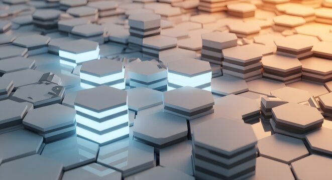 Abstract 3D hexagonal tiles arranged in a honeycomb pattern with vibrant gradient lighting in orange, pink, purple, and blue hues creating a futuristic and dynamic effect
