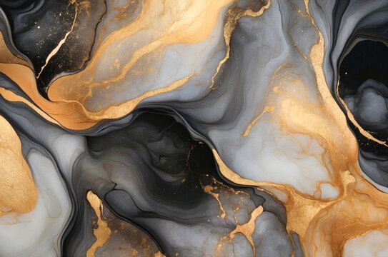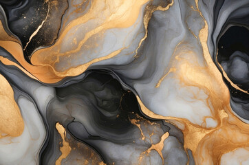 An elegant abstract background featuring flowing black and gray ink patterns with gold accents.