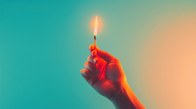 photograph of Miscellaneous banner with hand holding lit matchstick, gradient background, space for text wide angle lens