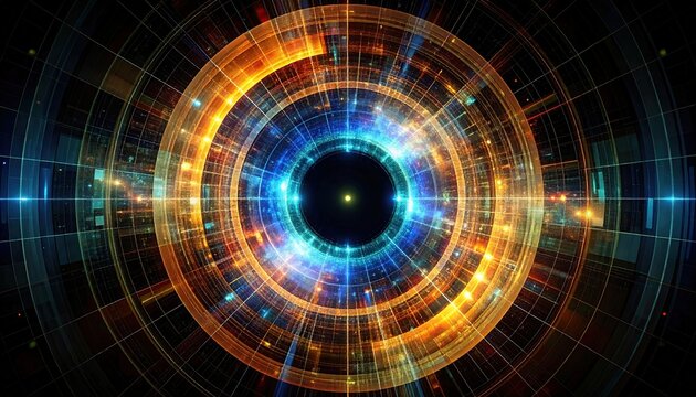 A vibrant abstract background featuring a futuristic tunnel of glowing blue and orange concentric circles and radial lines.