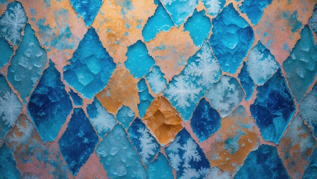 Abstract pattern featuring textured blue and orange shapes with snowflake designs on a colorful background