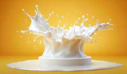 dynamic milk splash crown on round white pedestal with pooled milk and scattered droplets against vibrant orange background, playful and energetic