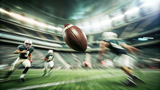 Dynamic American football suspended mid-air under bright stadium lights creating an intense atmosphere for game day excitement and athletic competition