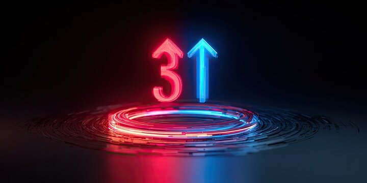 Glowing orange arrow rises over digital bar chart, symbolizing growth and success in futuristic setting. background features blurred blue and red lights, adding dynamic feel