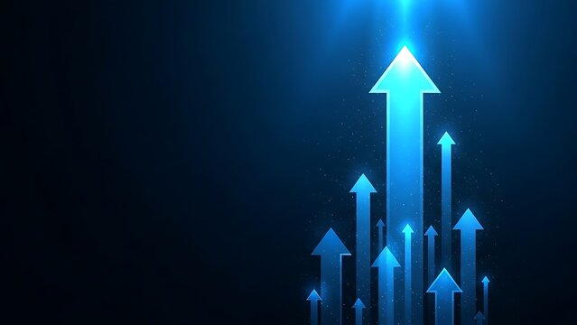 Blue arrows pointing upwards on dark blue background with light streaks growth