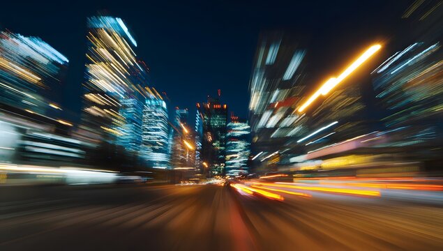 Abstract motion blur of a vibrant city skyline at night with streaks of colorful light from buildings and vehicles creating a dynamic urban atmosphere