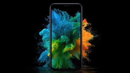 Vibrant magenta cyan green and yellow liquids explosively splash from a dark round pot against a black background creating dynamic intertwined forms