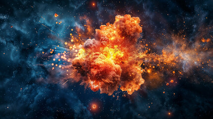 Cosmic explosion with vibrant orange cloud formation against deep blue space background. Stellar burst with glowing particles and luminous embers spreading outward resembling supernova or nebula birt