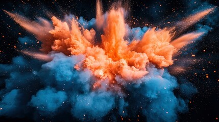 Exploding vibrant orange and blue powder cloud against a dark starry background