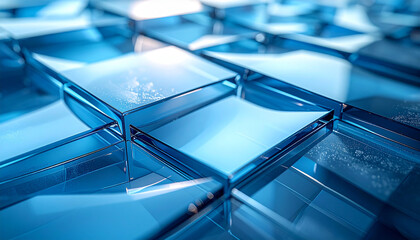 Abstract Glass Tile Display: A close-up view presents an artistic arrangement of glossy blue glass tiles, creating a mesmerizing pattern of light and reflection.