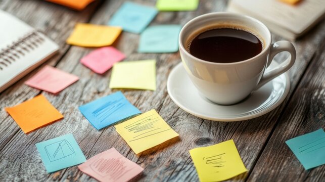 Coffee resting on a wooden desk, surrounded by vibrant, scattered sticky notes, captures the essence of a dynamic brainstorming session filled with creativity and innovative ideas