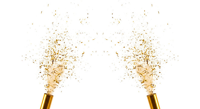 Two Gold Confetti Cannons Exploding with Streamers and Glitter on Black explosion isolated on a transparent background