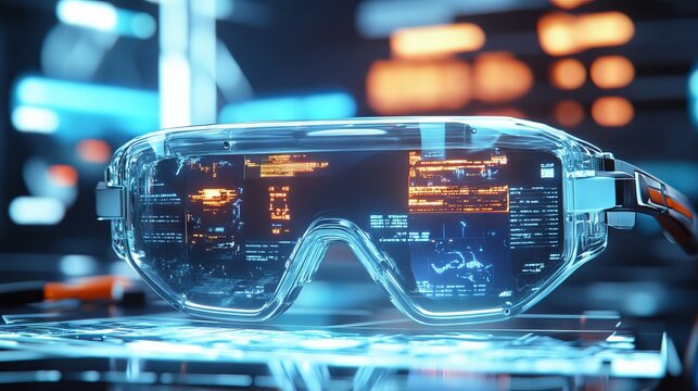 Futuristic CGI concept of virtual reality simulator glasses with advanced technology and immersive digital interface