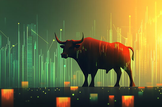 Dynamic Bull Charging through a futuristic financial cityscape, symbolizing Market Strength and growth,