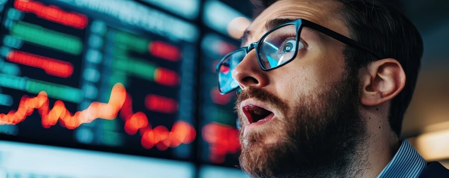 A surprised man gazes at stock market data, displaying intense emotions as he reacts to fluctuating financial trends on a screen.